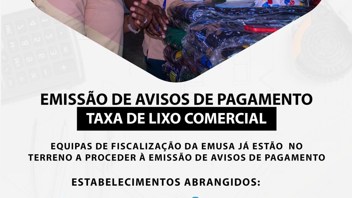 A EMUSA (Empresa Municipal de Saneamento de Quelimane) informa a todos os proprietários de estabelecimentos comerciais e residentes que as suas equipas de fiscalização já se encontram no terreno para a emissão dos Avisos de Pagamento da Taxa de Lixo Comercial.